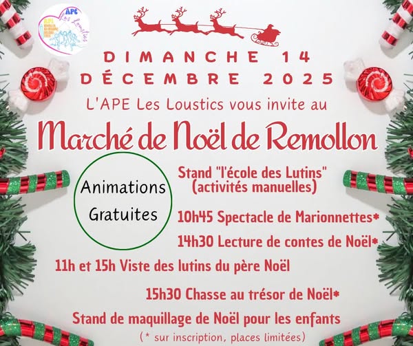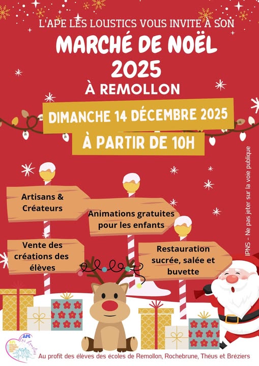 Dimanche 14 décembre dès 10 h le marché de Noël ouvrira ses portes, place de l’Hermitane. Organisé par l’association de parents d’élèves les Loustics, il est réalisé au profit du regroupement pédagogique les Demoiselles Coiffées qui rassemble les enfants des communes de Bréziers, Remollon, Rochebrune et Théus.