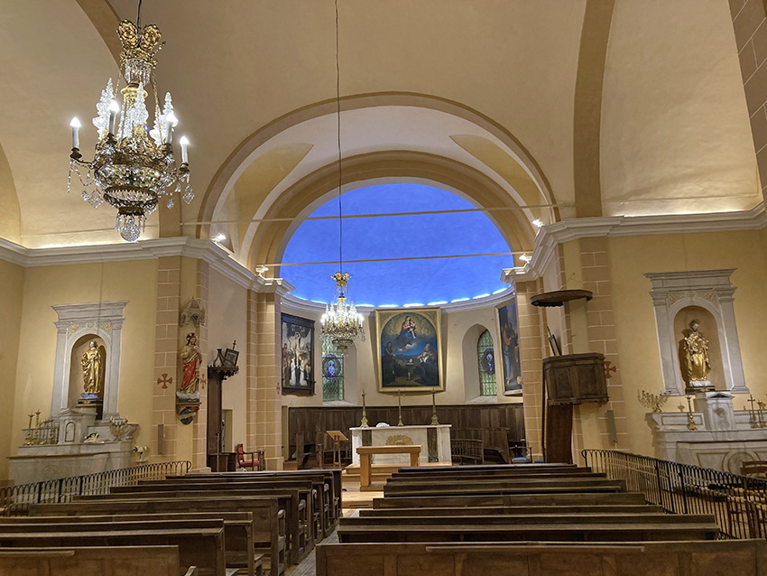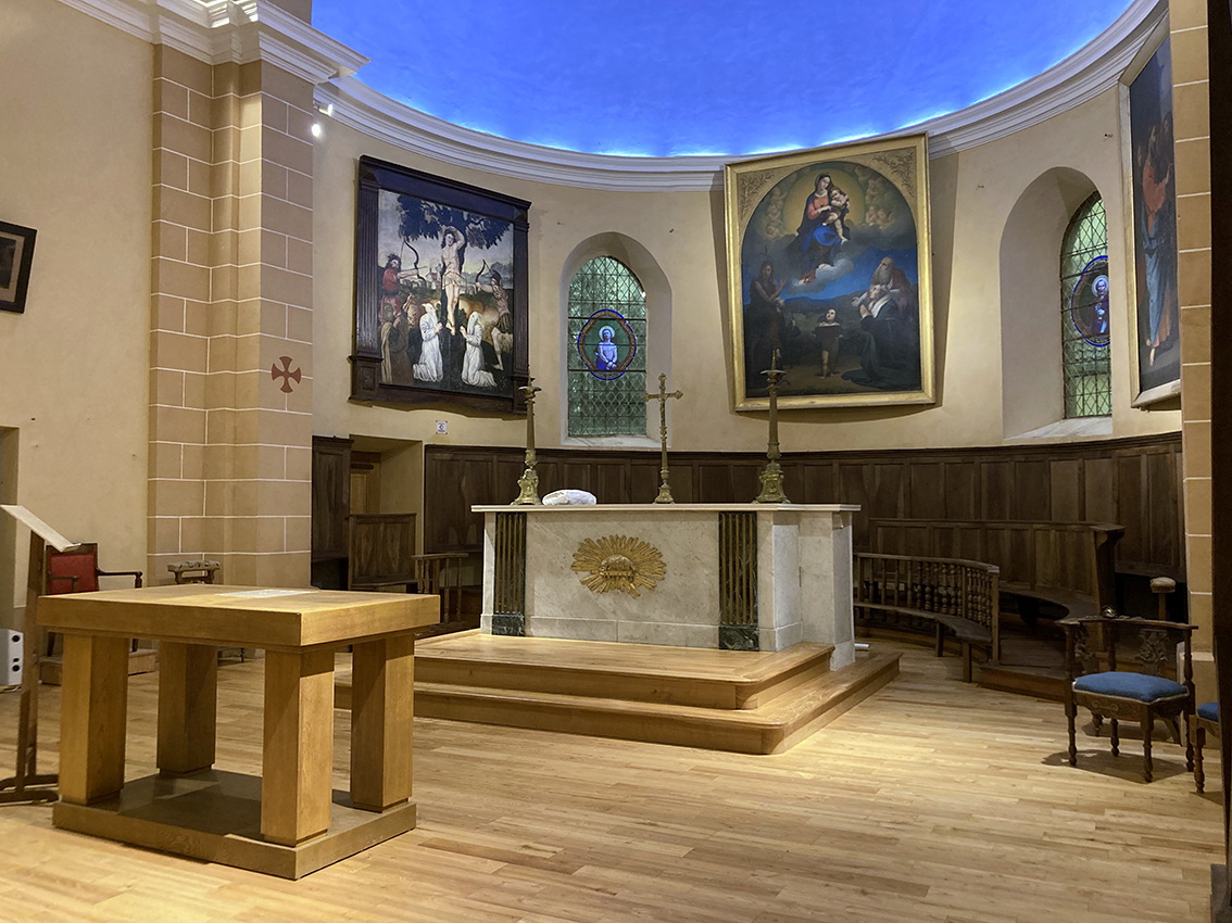 Le nouvel autel en bois récupéré par la paroisse de Remollon (merci Bernard) s’intégre parfaitement au nouveau plancher en châtaigner et à la nouvelle estrade en chaîne clair qui entoure le maître autel en marbre blanc.