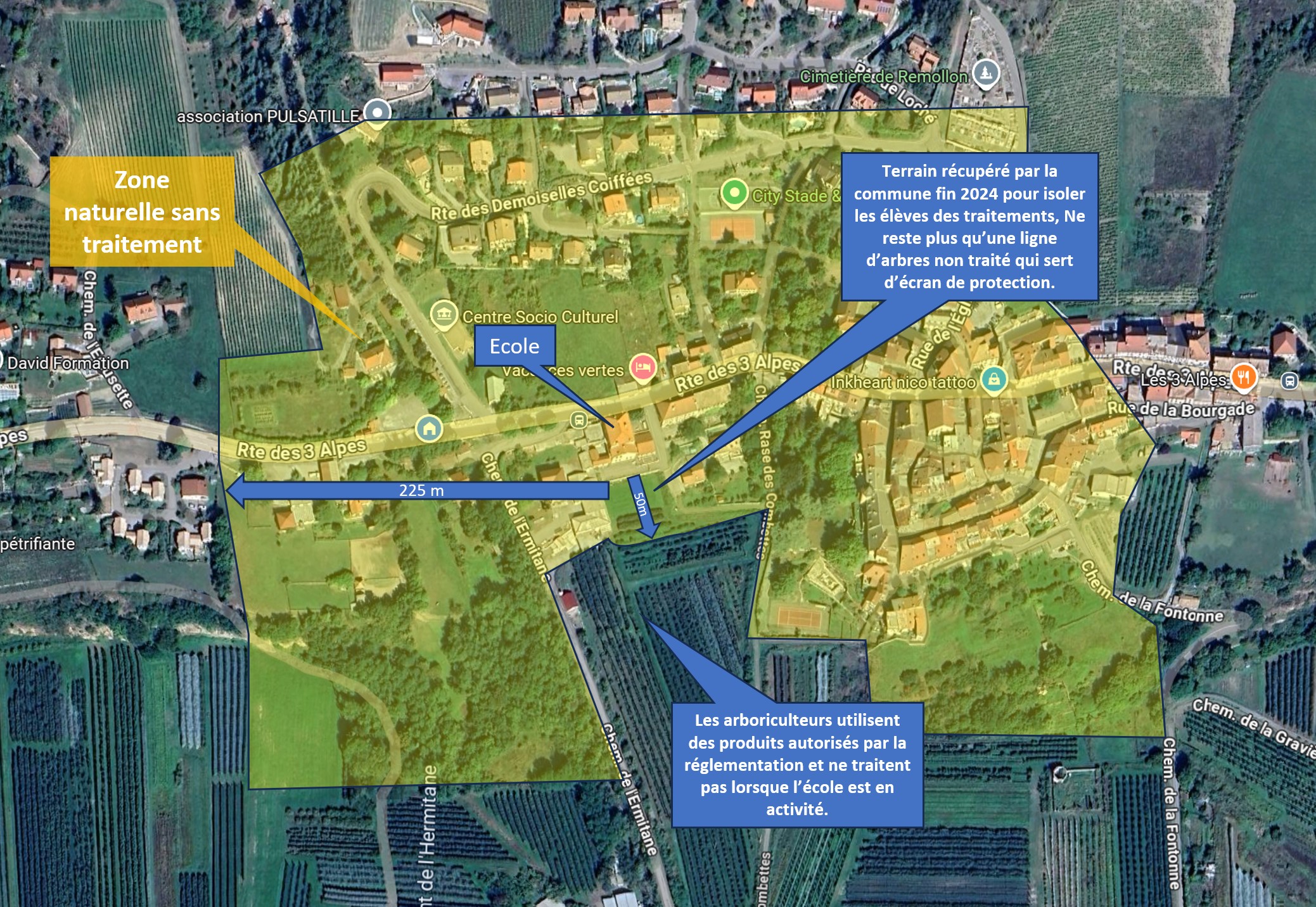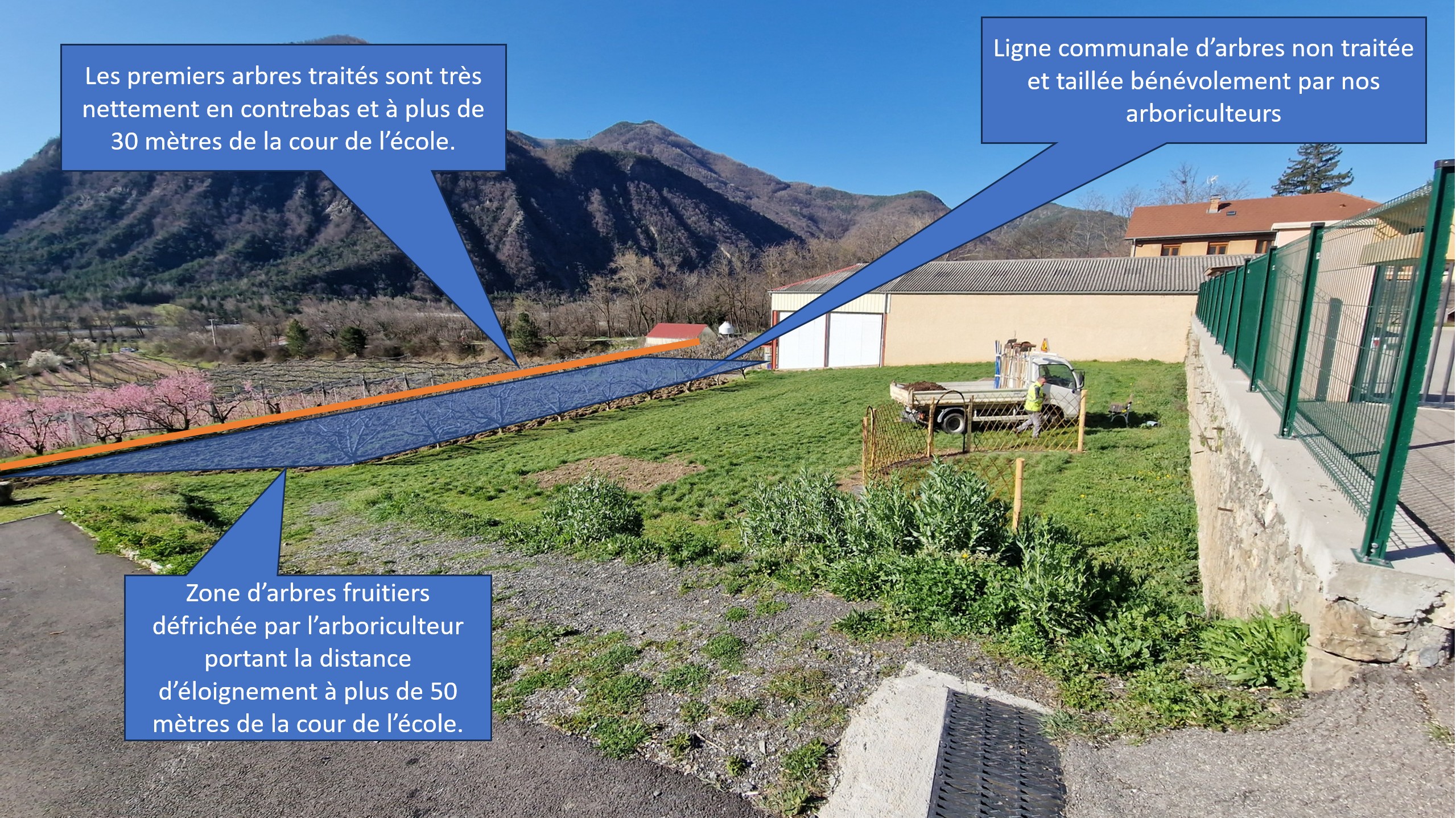 Le plan de situation montre que le risque est circonscrit à la façade sud de l’école. La récupération par la commune du terrain situé en contrebas permet d’éloigner ce risque à plus de 50 mètres. Par ailleurs, la sensibilisation des arboriculteurs, qui s’abstiennent de tout traitement en présence d’activités scolaires, contribue à réduire encore davantage le niveau de danger.