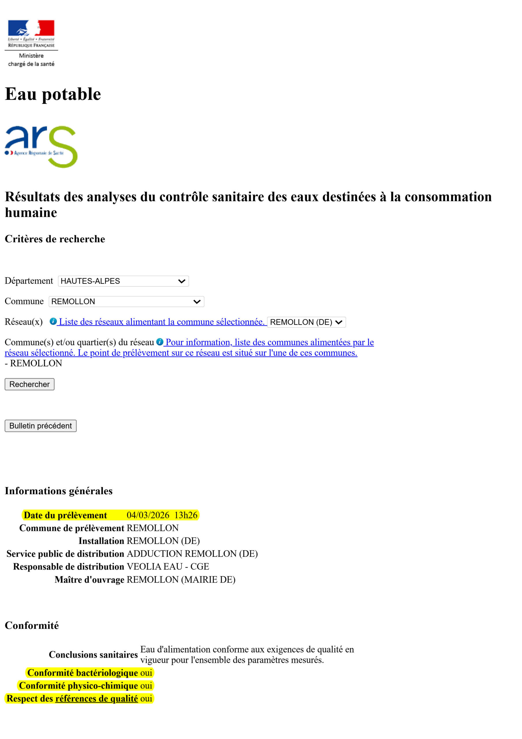 Nous avons le plaisir de partager avec vous les derniers résultats de l’Agence Régionale de Santé concernant la qualité de l’eau distribuée dans notre commune. Bonne nouvelle : elle est irréprochable.